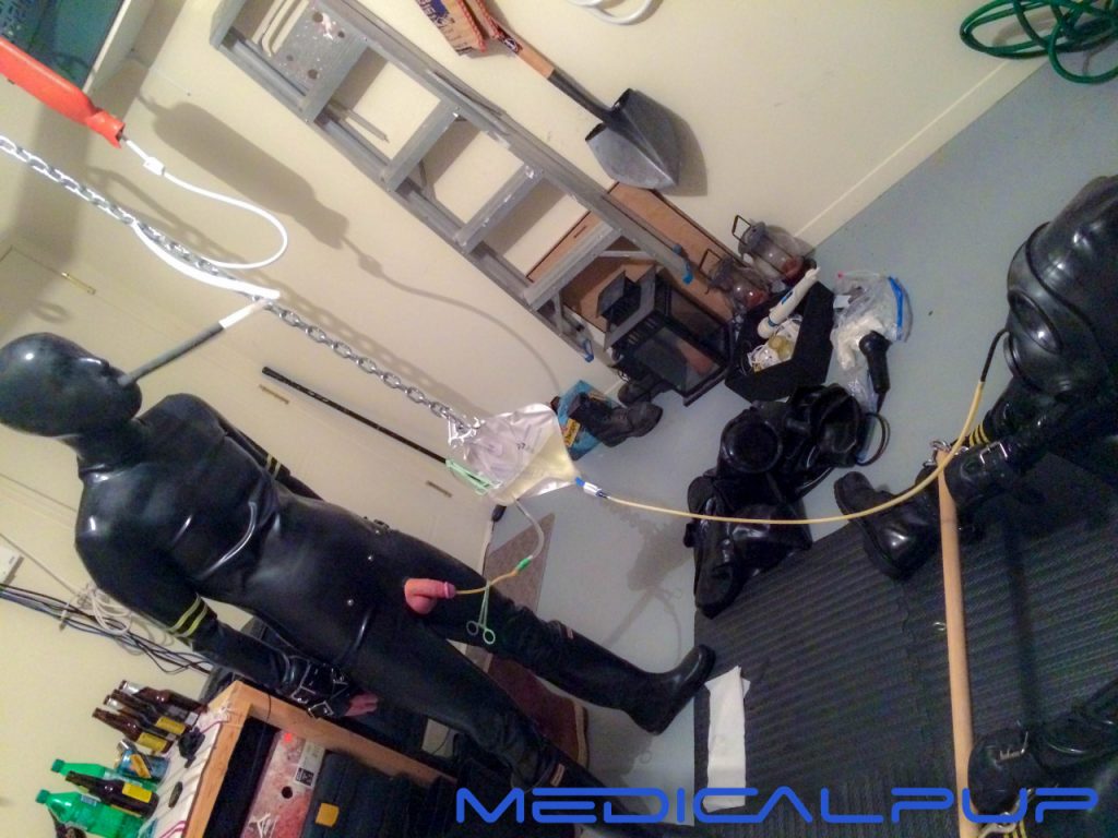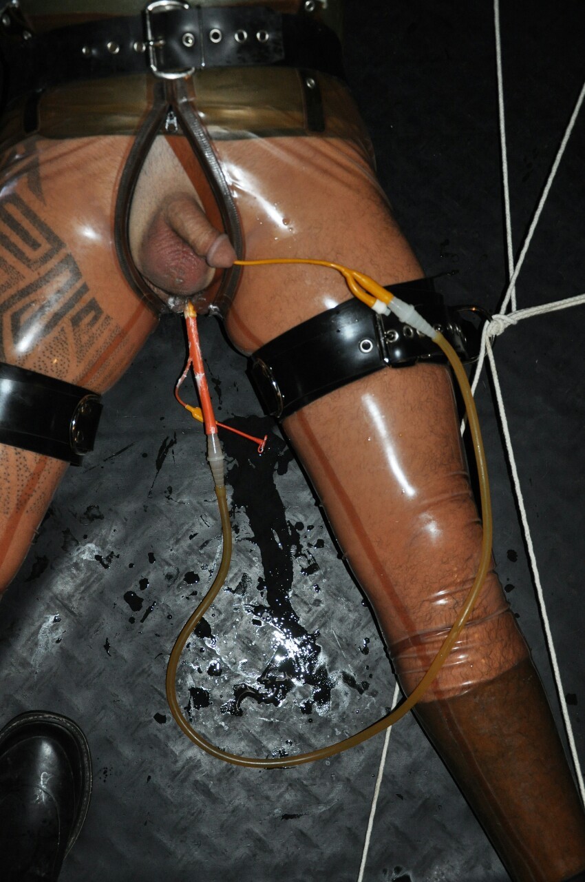This is where the benefits of a catheter start to come into their own. Because one can be inserted for a few weeks (or months with certain ones) without much maintenence and it dramatically changes the way the slave functions and behaves a Master can use everything from insertion to the fact it is constantly pissing to removal/change to emphasise that the slave is different and beneith Master. That the slave is changed from how it used to be, that it is completely under Master’s control and has given up everything for him and that it is all done so that it can better serve Master etc. There can also be other psycological factors that having a slave wear a catheter could bring. Take the nappy example above. If they slave were wearing a catheter it doesn’t just think that it could be there for a long time it thinks there could be no reason for Master to change its situation for an extremely long time, which is something in certain situations that it could find terrifying. The semi-permanance of a catheter also means that the slave does not know from the outset what could last for a long time and what isn’t likely to. They all could last a long time. Master also still has access to it’s balls, hole and penis so can torment these as well any times he wanted. The slave can also be left to drip piss on itself as a form of water torture or be forced to directly drink it’s own piss or give itself an enema. Psycologically these are very powerful things for most slaves.