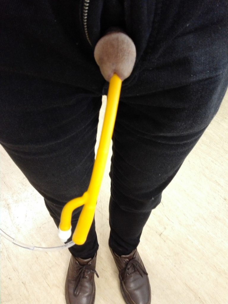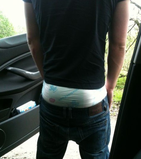 nappy: The catheter could be combined with a nappy so that the slave is constantly filling it’s nappy. This is one of those situations where wearing a nappy is a tool and as such is something i would still find fairly humiliating though other may not. Of course the nappy would start of normal but would uncontrollably swell through the day and start to show under clothes more and more. The nappy does need to be changed but i found that i went much longer between changes as i wasn’t focusing on how much i filled it – often getting to the point it started leaking after about 12 hours use. i also found that i had to reach down the front of the wet nappy every hour or so to reposition the tube. Suited to use around the house, in public, over night use or at times where a bag isn’t an option. Because of how much it fills it could cause the slave to have to adjust how it walks, moves or sleeps
